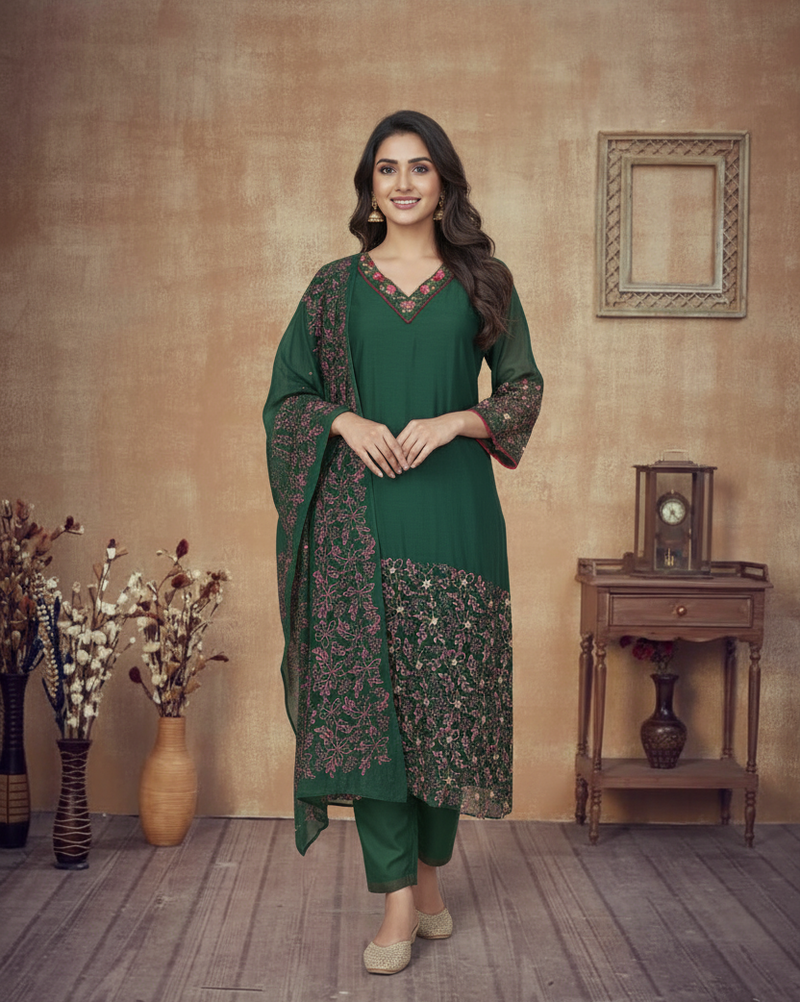 Pure Chanderi Bottle Green kurta highlighted with Zari and Thread Embroidered neck work And Heavy Daman work, pant and Printed Dupatta. Comfortable for Festive wear.