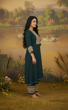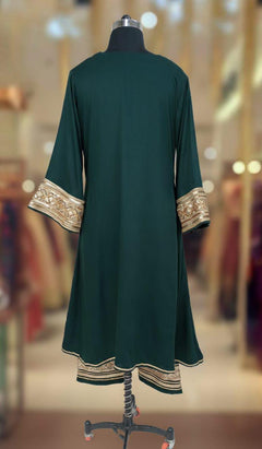 Bottle Green Gazi Silk kurta highlighted with heavy embroidered neck work, with heavy embroidered sleeve. And Pant with Heavy embroidered Lace border. Comfortable for Festive wear.