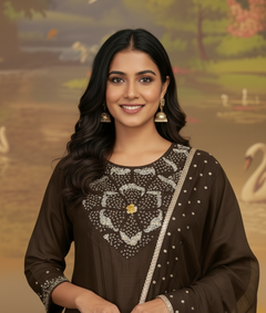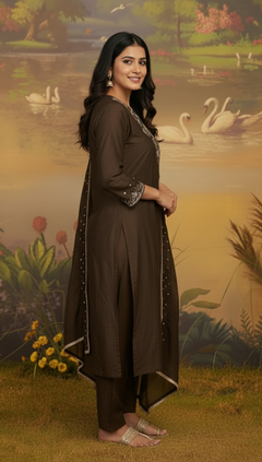 Pure Chanderi Brown kurta highlighted with Heavy motti sequins neck work, pant and Dupatta with Lace Border. Comfortable for Festive wear.