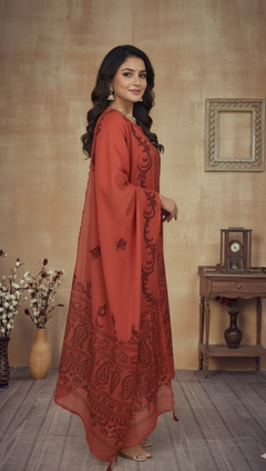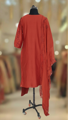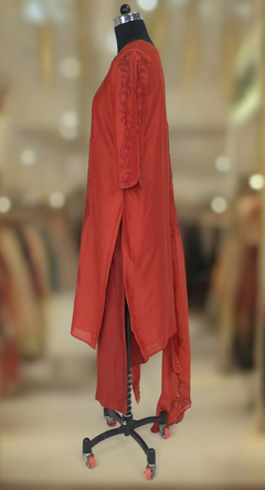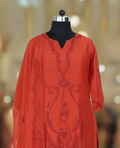 Pure Chanderi Dark Orange kurta With All Over Applique Work, pant and Printed Dupatta. Comfortable for Festive wear.
