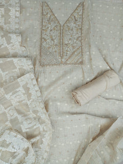 Chanderi Kurta Highlighted With Embroidered Neck Work, With Pant And Chanderi Self woven Dupatta. Comfortable Festive Wear Look.