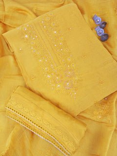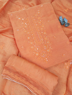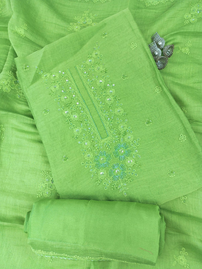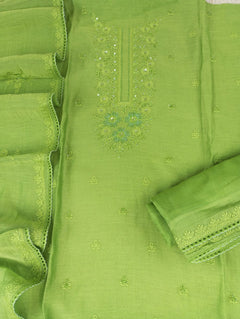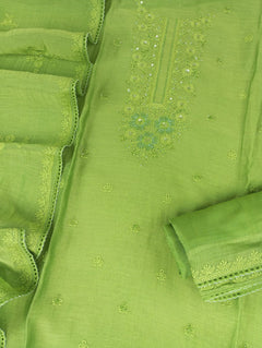 Mul-Chanderi suit set, highlighted by intricate thread embroidery and delicate sequin accents on the neckline. Paired with matching Bottom and embroidered dupatta. Perfect for Festive Wear.