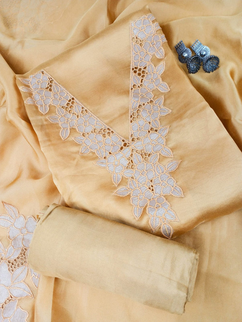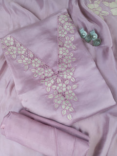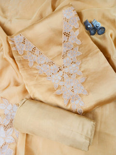 A Tissue suit set beautifully highlighted with delicate lace embroidery along the neckline and dupatta border. Paired with a matching bottom and elegant dupatta, this ensemble is perfect for festive occasions.