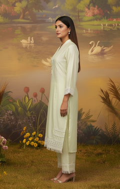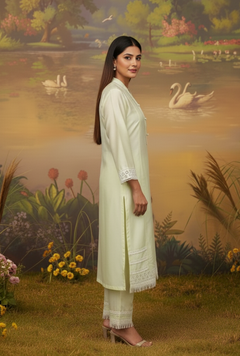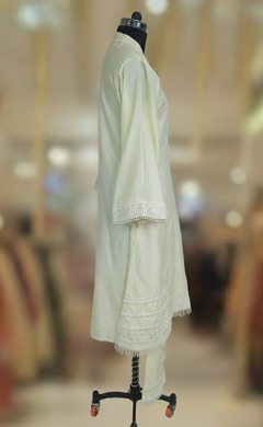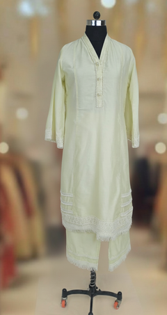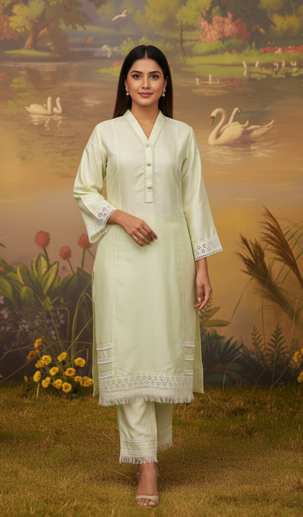 Dola Silk Light Pista Green kurta highlighted with neck work and Daman with Lace work, And pant with Lace Border. Comfortable for Festive wear.
