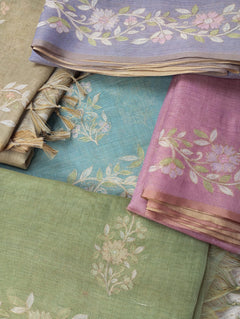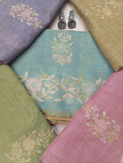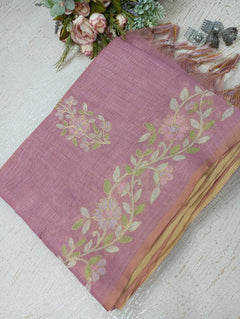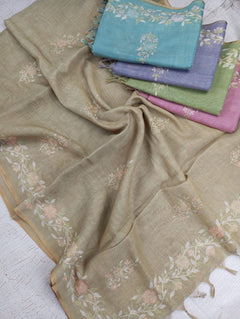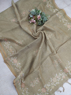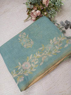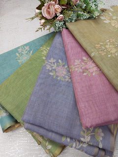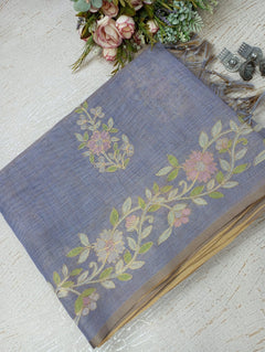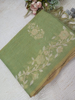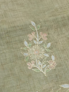This Linen Tissue Saree features exquisite floral Aari embroidery along the border and pallu. The soft, sheer texture of linen tissue adds a subtle sheen, giving it a refined and graceful drape. Perfect for festive gatherings, cultural events, or elegant daywear. Comes with a matching unstitched blouse piece.