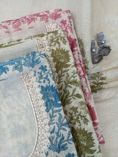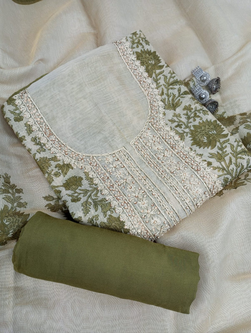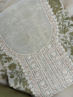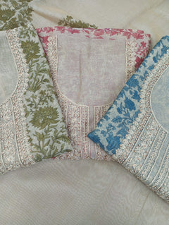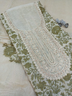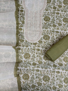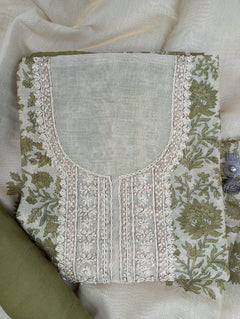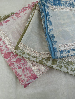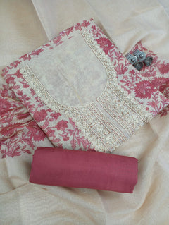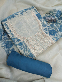 A delicate Chanderi tissue printed suit set . The kurta features intricate thread work. Paired with a matching bottom and a  printed dupatta, this unstitched set offers a blend of tradition and modern grace, ideal for elegant day events and gatherings.