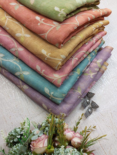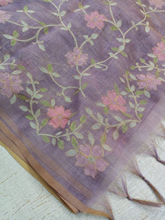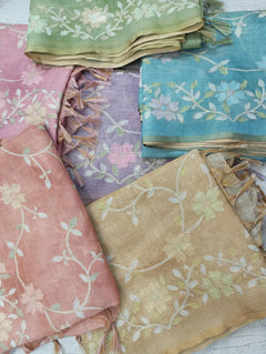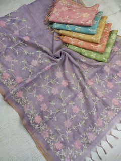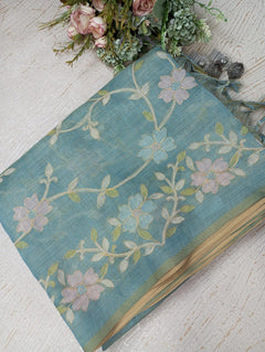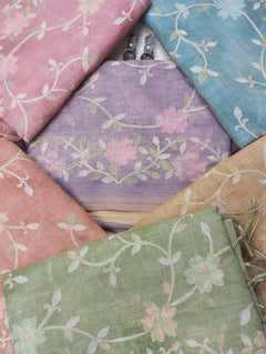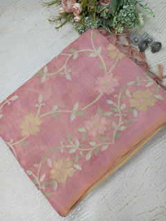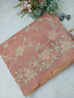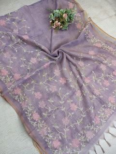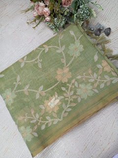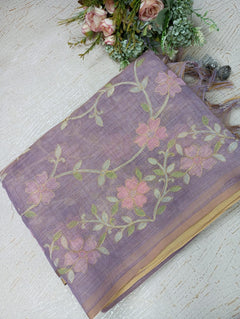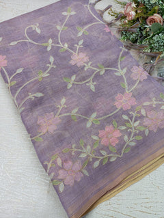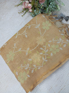 This Linen Tissue Saree features exquisite floral Aari embroidery along the border and pallu. The soft, sheer texture of linen tissue adds a subtle sheen, giving it a refined and graceful drape. Perfect for festive gatherings, cultural events, or elegant daywear. Comes with a matching unstitched blouse piece.