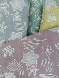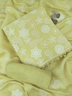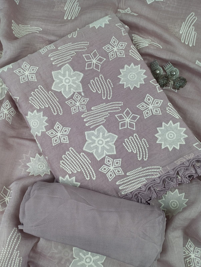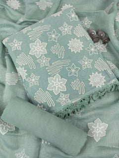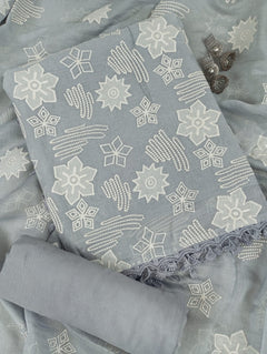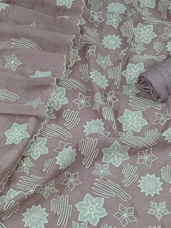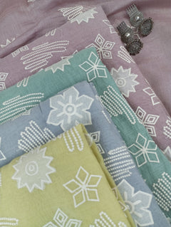 Mull Chanderi suit set, adorned with delicate thread and flower Patch work kurta. Paired with matching Bottom and embroidered dupatta with lace border. This ensemble is a must-have for your ethnic collection.