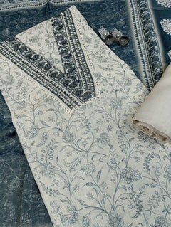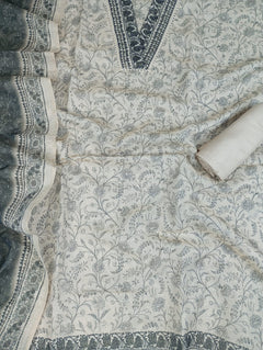 Linen Cotton Printed Kurta Highlighted With Neck Work, With Pant And Linen Cotton Printed Dupatta. Comfortable Festive Wear Look.