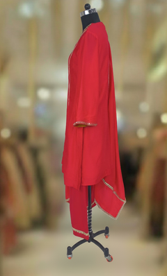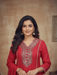 Tussar Silk Red kurta highlighted with moti sequins neck work and with pant with Lace Border And Dupatta. Comfortable for Festive wear.