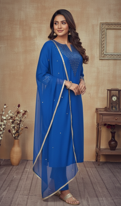 Tussar Silk Royal Blue kurta highlighted with Mirror neck work and with pant with Lace Border And Dupatta. Comfortable for Festive wear.