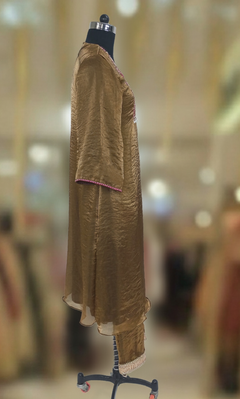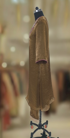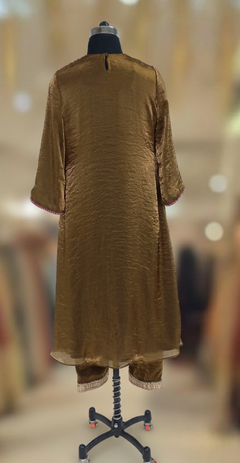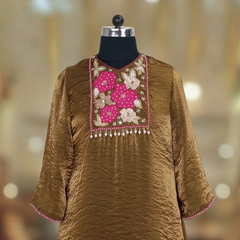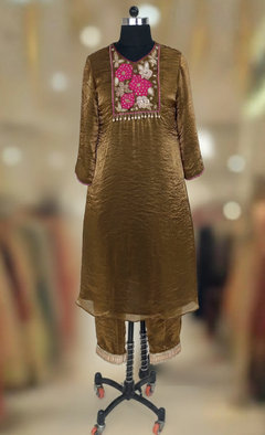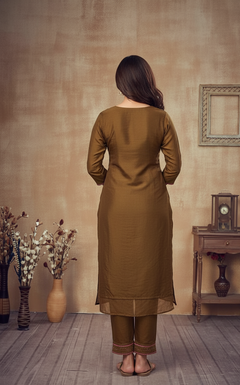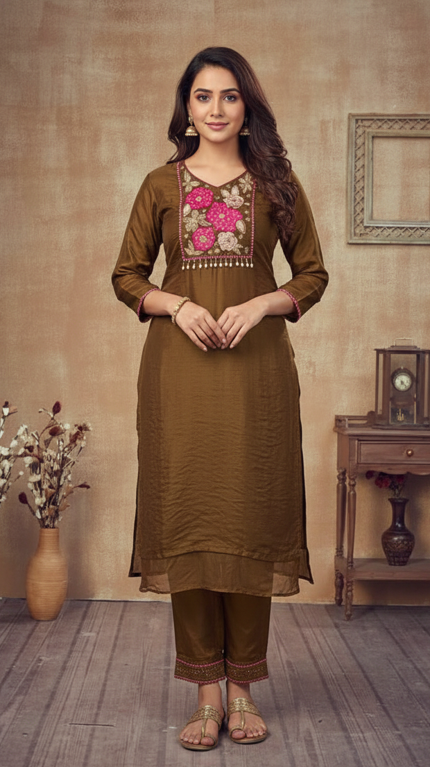 Shimmer Organza kurta highlighted with neck work and with pant with Lace Border. Comfortable for Festive wear.