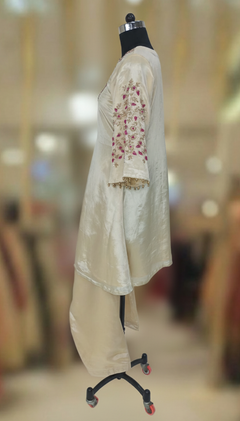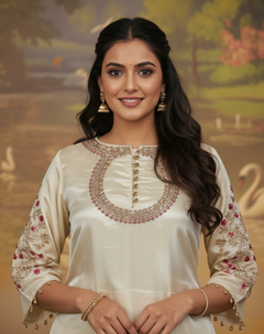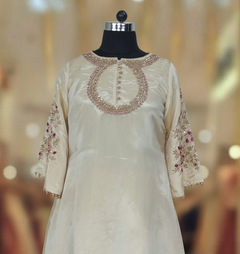 Shimmer Tissue kurta highlighted with zari Embroidery neck work, with heavy zari embroidered Sleeve. with Farshi Salwar. Comfortable for Festive wear.