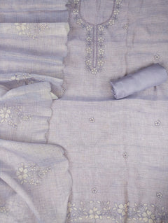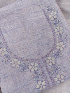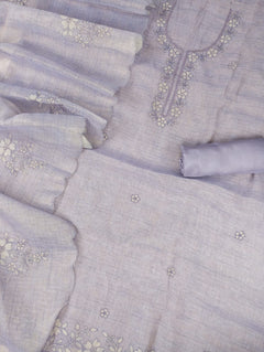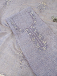 A serene Chanderi Tissue suit set. It features detailed floral patch with aari work outlining the U-neckline and a stylized floral border along the hem and dupatta edges. This elegant unstitched set, paired with a matching bottom, is perfect for sophisticated day events or festive gatherings.