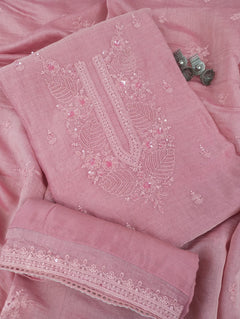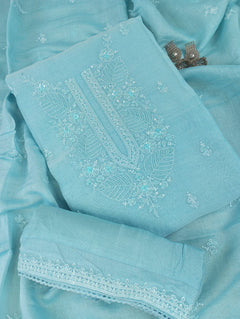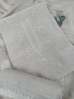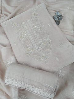 Mul-Chanderi suit set, highlighted by intricate thread embroidery and delicate sequin accents on the neckline. Paired with matching Bottom with lace finishing and embroidered dupatta. Perfect for Festive Wear.