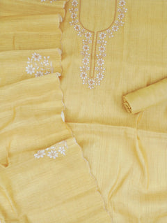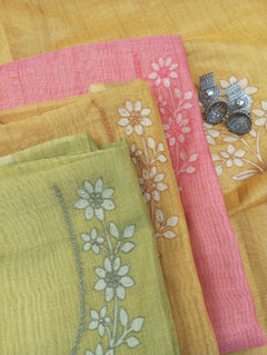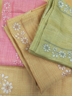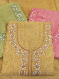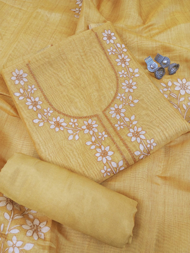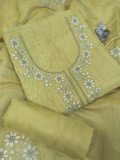 Radiate effortless charm with this Chanderi Tissue embroidered suit set. The kurta features delicate Patch floral embroidery along the neckline, adding a touch of grace and freshness to the look. The matching dupatta carries the same floral accents with a subtle scalloped edge, completing the ensemble with refined elegance.