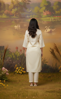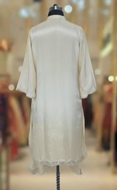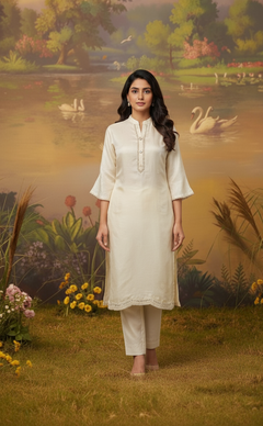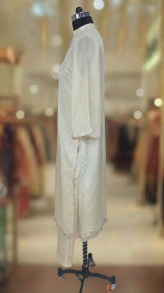 Tissue kurta highlighted with neck work, with heavy lace daman work. with pant. Comfortable for Festive wear.