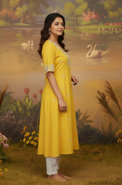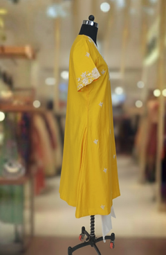 Dola Silk Yellow kurta highlighted with embroidered neck work and Butti work, with white pant. Comfortable for Festive wear.